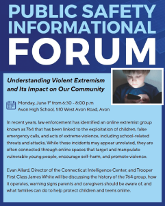 March 13, 2026The Public Safety Informational Forum "Understanding Violent Extremism and Its Impact on Our Community" has been rescheduled to Monday, June 1, 6:30 p.m. to 8 p.m. at Avon High School.