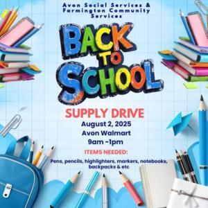 July 31, 2025Avon Social Services and Farmington Community Services are joining forces on a "Back to School Supply Drive" at the Avon Walmart Store, 255 West Main Street, on Saturday from 9 a.m. to 1 p.m.