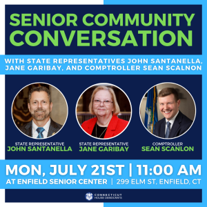 July 14, 2025I would like to extend an invitation to any seniors who are interested in a senior community conversation with me and my legislative colleague, Rep. John Santanella of Enfield, and State Comptroller Sean Scanlon. It takes place at the Enfield Senior Center on July 21 at 11 a.m. Hope to see you there!