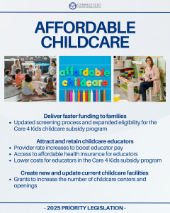 March 7, 2025Affordable and accessible childcare is essential for Connecticut families and businesses to thrive. H.B. 5003, a top legislative priority for House Democrats this session, will expedite funding for families, attract and retain childcare educators, and enhance both new and existing childcare facilities.