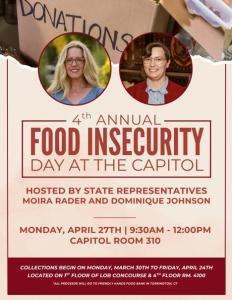 Reps. Rader and Johnson will host the 4th Annual Food Insecurity Day at the Capitol on Monday, April 27. Hear from legislators and advocates about food insecurity and efforts to support our critical food banks and pantries.