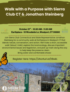 October 14, 2025Sierra Club Connecticut and I will hold a community walk at Earthplace in Westport on Tuesday, October 21. We’ll take a short, accessible walk (about 1 mile), explore the local ecology, discuss important environmental issues and legislation, and pick up trash along the way to help keep the preserve clean.