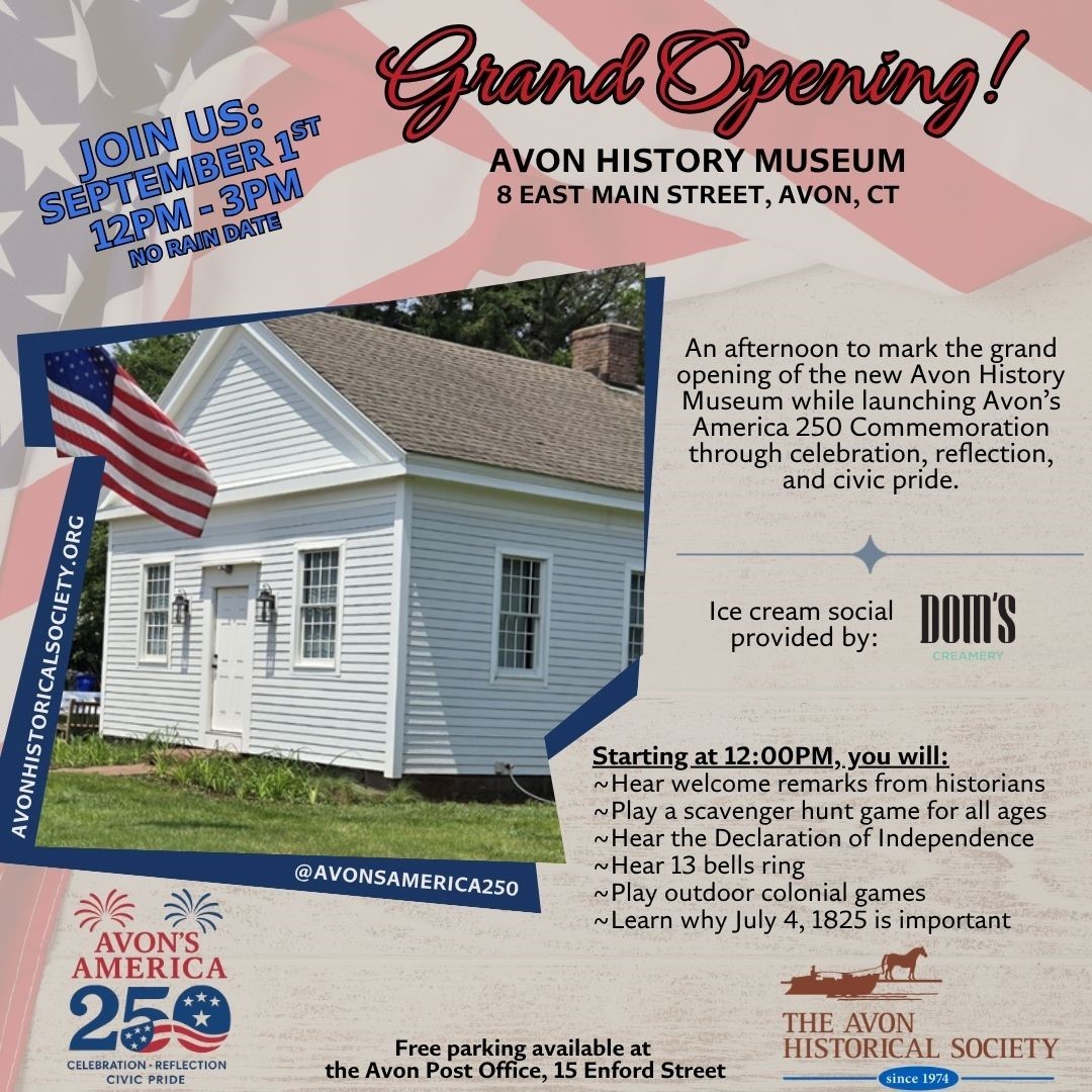 August 28, 2025The grand opening of the Avon History Museum, 8 East Main Street, is on Monday, from noon to 3 p.m. Check out this family-friendly event. Check out this family-friendly event. See more details on the flyer below.