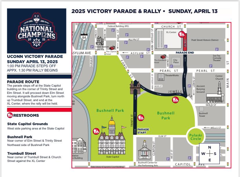 April 11, 2025Congratulations to the UConn Women's Basketball team for winning a 12th national title! The Lady Huskies have plenty of experience with parades. Another one comes to downtown Hartford on Sunday, beginning at 1 p.m. Please see the image, which includes the parade route, below.