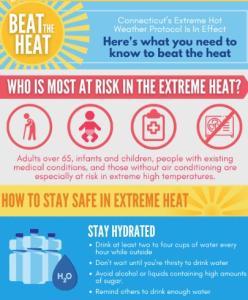 August 13, 2025Connecticut’s Extreme Hot Weather Protocol is in effect at least through 8 p.m., Thursday, Aug. 14. July 18. Please take all necessary precautions and check in on neighbors who may need assistance.