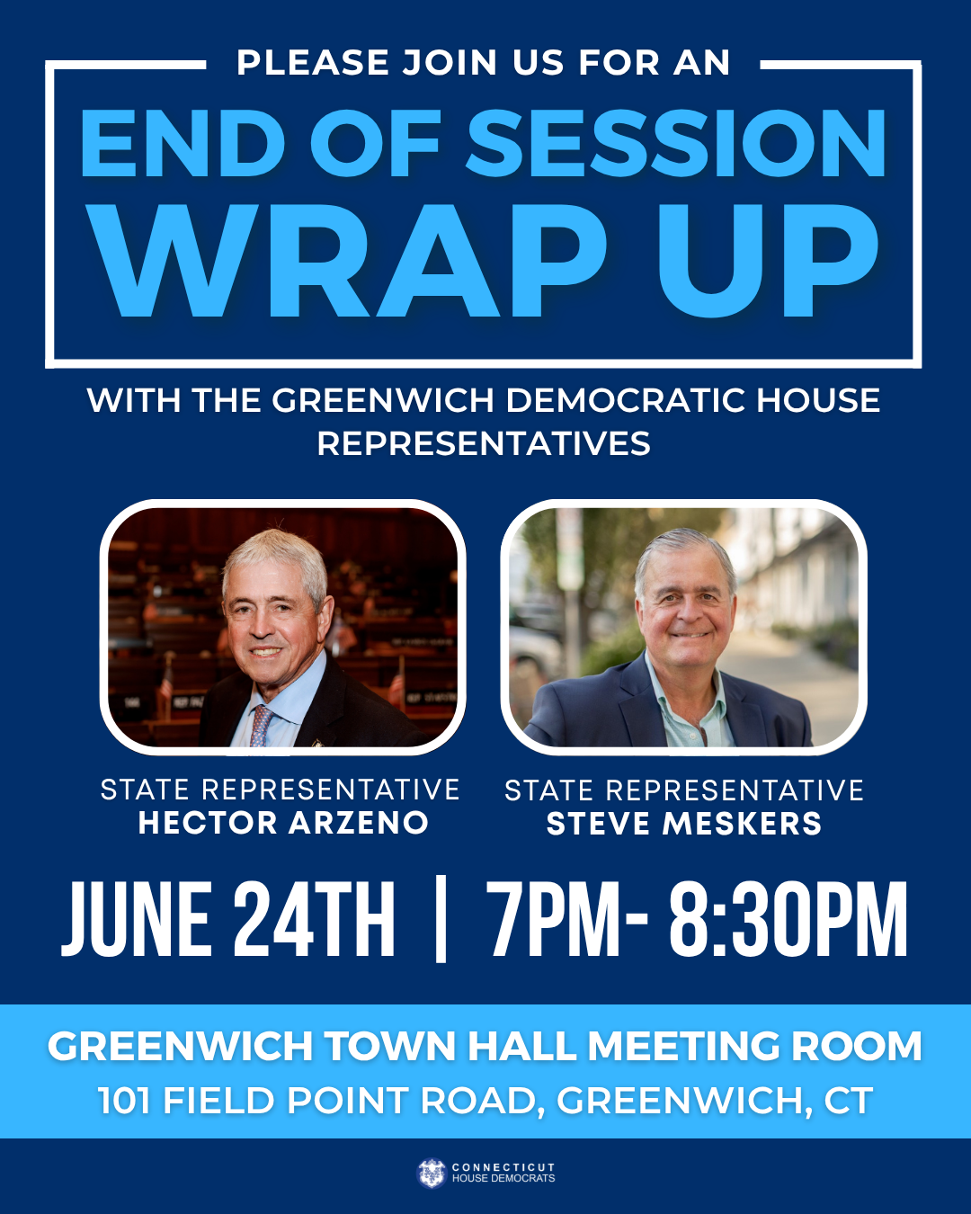 June 20, 2025I am following up with an invitation to join me and State Representative Hector Arzeno for an end-of-session wrap-up at the Greenwich Town Hall Meeting Room on Tuesday, June 24th, from 7 p.m. to 8:30 p.m.