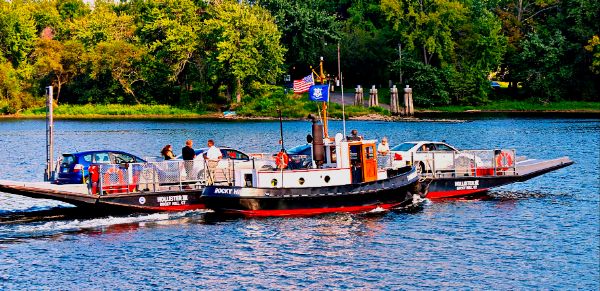 The ferry service between Rocky Hill and Glastonbury is America’s oldest continuously operating ferry, dating back to 1655 when small raft was pushed across the Connecticut River using long poles. At one time, a horse on a treadmill in the center of a boat supplied the power to propel the craft across the river. Today's ferry is an open flatboat named the "Hollister III"; this three-car barge is towed back and forth by the "Cumberland," a diesel powered towboat.