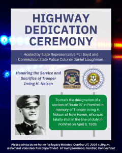 October 21, 2025I would like to invite you all to join me, State Senator Mae Flexer, State Comptroller Sean Scanlon, Town of Pomfret officials, and the Connecticut State Police for a Highway Dedication Ceremony in honor of State Trooper Irving H. Nelson. The Highway Dedication Ceremony will take place on Monday, October 27th, at 4:30 p.m. at the Pomfret Volunteer Fire Department. A section along Route 97 in Pomfret will be dedicated to Trooper Nelson of New Haven, who tragically lost his life in the line of duty in Pomfret on April 6th, 1928.