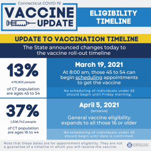 March 15, 2021Good news! The State announced several key updates regarding the phasing and pace of Connecticut’s COVID-19 vaccine roll-out.