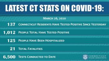 March 26, 2020The latest numbers compiled by the State Public Health Lab show another 137 residents have tested positive for COVID-19. It brings the total number of positive cases in Connecticut to 1,012.
