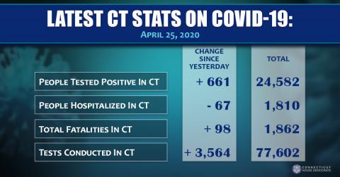 April 26, 2020As the State of Connecticut continues taking actions in response to the global spread of coronavirus disease (COVID-19), Governor Ned Lamont provided the following updates as of 4:00 p.m. on Saturday, April 25, 2020