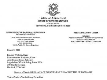 March 2, 2020The Legislature is again considering a bill to legalize cannabis for adult, recreational use. Senate Bill 16, An Act Concerning the Adult Use of Cannabis, was the subject of a public hearing today before the Judiciary Committee.