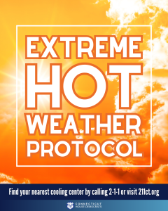 August 8, 2025Due to an anticipated stretch of high temperatures, the state is activating its Extreme Hot Weather Protocol, effective at noon on Monday, August 11. The protocol will remain in effect through at least 8 p.m. on Thursday, August 14. Cooling centers will be available throughout the state. Anyone in need of a place to get out of the heat can locate their nearest cooling center by calling 2-1-1 or viewing the list that will be published online at 211ct.org.