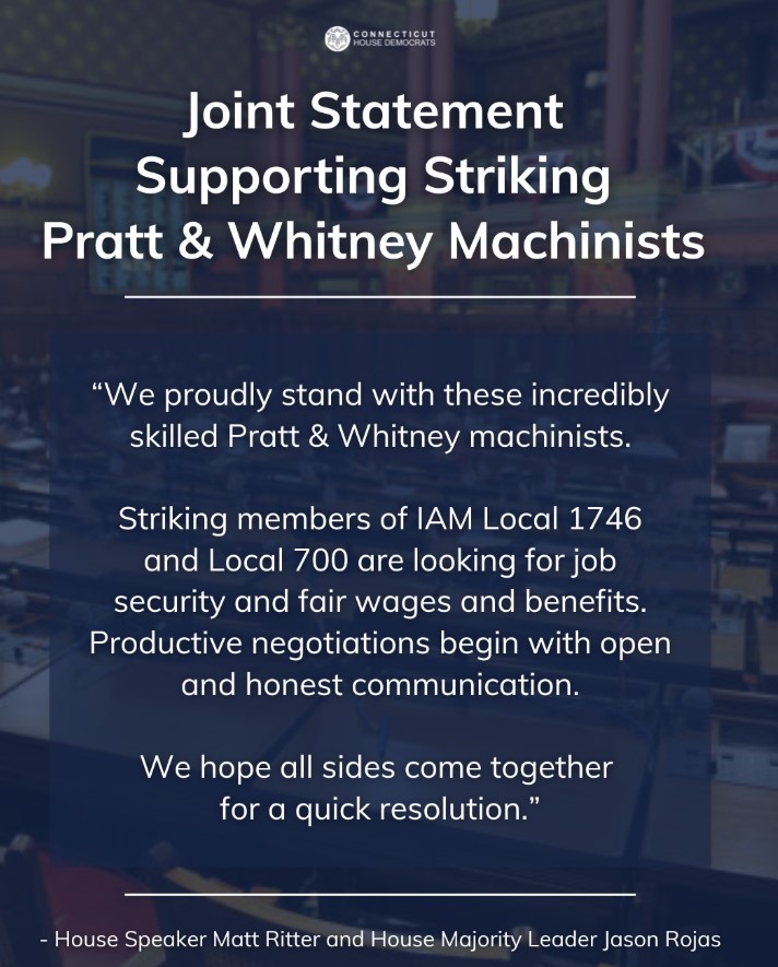 I stand in full support of our machinists at Pratt & Whitney who continue to make Connecticut a leader in the aerospace field. East Hartford is steeped in pride and traditions around Pratt, and their workforce. We ask that RTX return to the table in good faith and commit to their employees, our towns, and our state. Please see the statement of support for the striking machinists from House Speaker Matt Ritter and House Majority Leader Jason Rojas.