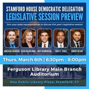 February 28, 2025Join me and the entire Stamford Delegation for a Legislative Session Preview on Thursday, March 6th from 6:30 P.M. - 8:00 P.M. We will discuss many topics related to this year's session and value your input and questions. This event is open to the public at the Ferguson Library Main Branch at One Public Library Plaza in Stamford.