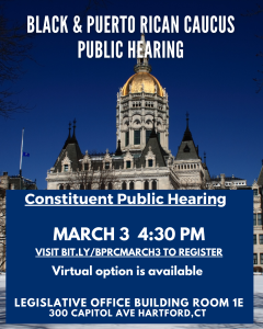 February 28, 2025The Connecticut Black & Puerto Rican Caucus is pleased to announce its upcoming public hearings, providing an opportunity for organizations and individuals to share their concerns and perspectives. Your input is invaluable, and we look forward to hearing from you.