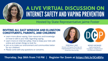 September 30, 2021REMINDER - Tonight, I am hosting a discussion on Internet Safety and Vaping. This event aims to inform and educate children as well as their parents on these important issues.