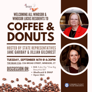 September 9, 2025Windsor & Windsor Locks residents - join Representatives Garibay & Gilchrest on Tuesday, September 16, at 6:30 p.m., at The Bean 226 to discuss the federal government's "Big, Beautiful Bill," Medicaid, & SNAP. There will also be time set aside for questions.