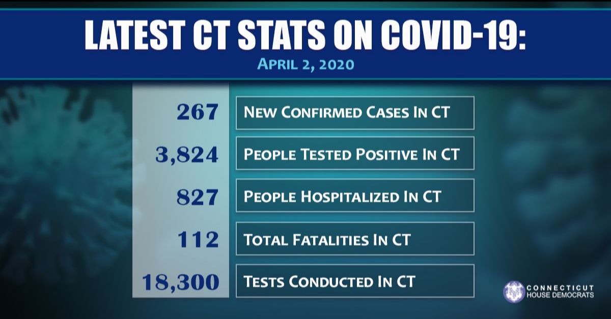 Since yesterday’s update, an additional 267 Connecticut residents have tested positive for COVID-19, bringing the statewide total to 3,824. To date, more than 18,300 tests have been conducted in Connecticut among both state and private laboratories. Approximately 827 patients have been hospitalized. The total statewide total number of fatalities is 112.