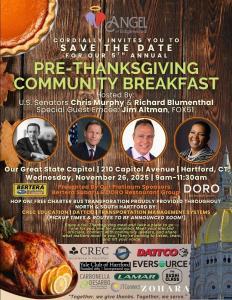 November 24, 2025You're invited to join Angel of Edgewood, Senator Blumenthal, and Senator Murphy at the State Capitol for a pre-Thanksgiving community breakfast on Wednesday morning. The CTDOT has also added additional trains to the Hartford Line for Thanksgiving holiday travel, and Friday marks the start of Hartford Winterfest (tree-lighting on Sunday)!