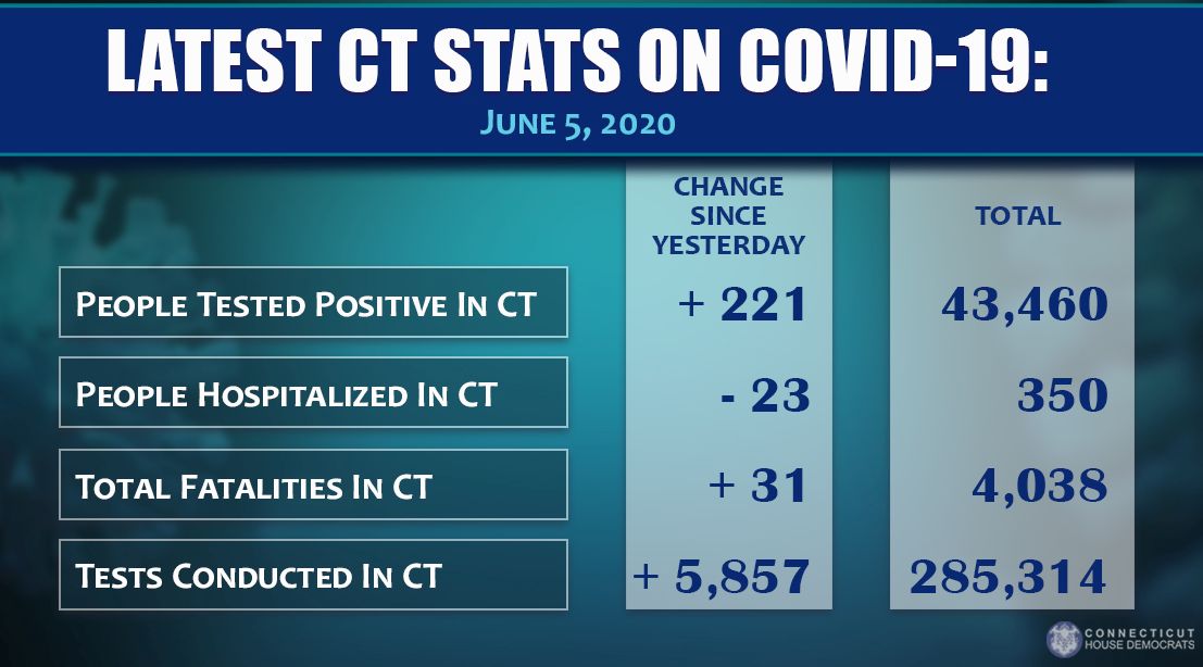 June 5, 2020Here are the latest Connecticut statistics on COVID-19 as well as an update from Governor Ned Lamont on the state's coronavirus response efforts.