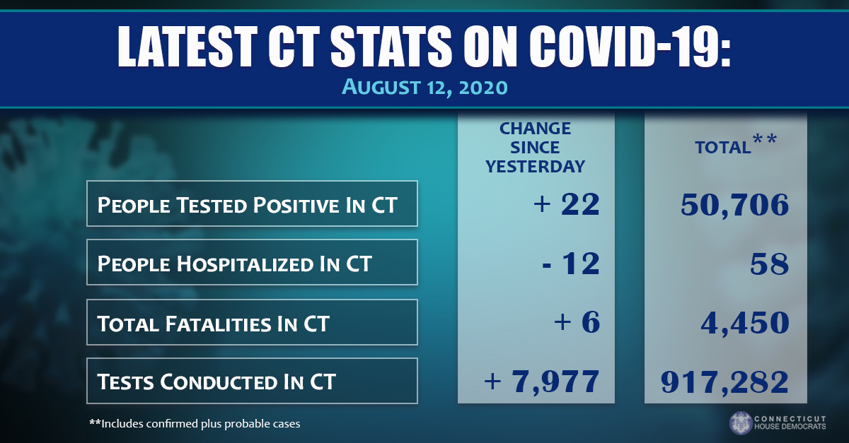 August 12, 2020Here is the August 12, 2020 update from Governor Ned Lamont regarding the state's coronavirus response efforts: