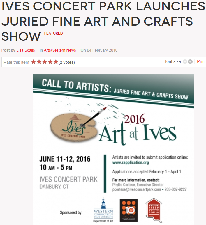 The Cultural Alliance of Western Connecticut is partnering with the nonprofit Friends of the Ives, Western Connecticut State University's Department of Art and the Brookfield Craft Center to present the Friends of the Ives' first “Art at Ives, Juried Fine Art & Crafts Show.” For more information, go to: www.ivesconcertpark.com.