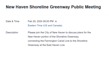 February 27, 2024Please join the City of New Haven for a public meeting on the New Haven portion of the Shoreline Greenway Trail, which will stretch from the intersection of East St. and Water St. to the East Haven Town Line. The virtual meeting is Thursday, February 29.