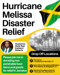 November 7, 2025As a reminder, I am holding a disaster relief drive for the residents of Jamaica. If you are able, please consider donating non perishable food items and goods. Donations can be dropped off at the Carver, New Vision International Ministries, and Stamford Excellence School.