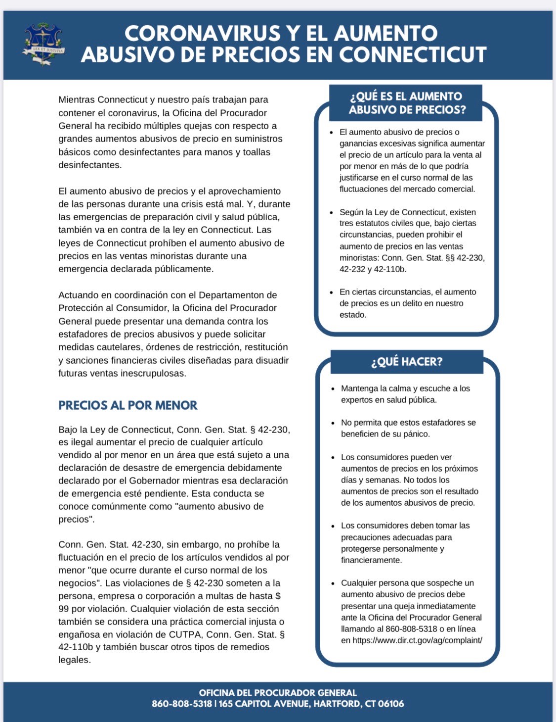 Cualquier persona que sospeche de aumentos abusivos debe someter una querella de inmediato a la oficina del procurador general en línea o llamando al 860-808-5318.