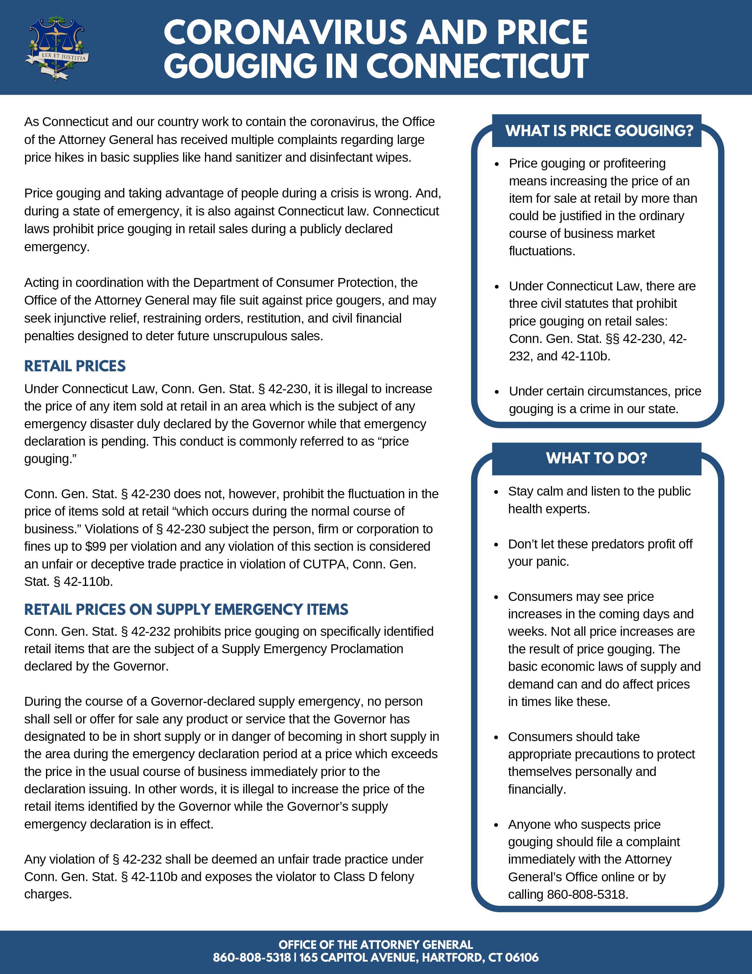 March 12, 2020Anyone who suspects price gouging should file a complaint immediately with the Attorney General’s Office online or by calling 860-808-5318.
