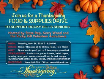 November 22, 2024Rocky Hill Volunteer Ambulance and I will host a Thanksgiving Food & Supplies Drive to support Rocky Hill's seniors at Senior Housing, 36 Willow Road, Rec. Room, on Tuesday, November 26th, from 5 p.m. to 6:30 p.m.