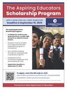 The Aspiring Educators Scholarship Program, established by the Connecticut General Assembly and administered by the CT State Department of Education (CSDE), is now open for applications!