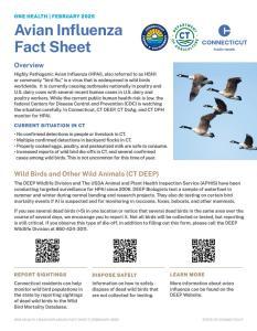 Avian Flu, also referred to as H5N1 or "bird flu," is a virus that is widespread in wild birds worldwide. It's causing outbreaks nationally in poultry and U.S. dairy cows, with several recent human cases in U.S. dairy and poultry workers. While the human health risk is low, the federal Centers for Disease Control (CDC) is monitoring the situation. The CT Department of Energy and Environmental Protection (CT DEEP) CT Department of Agriculture (DoAg), and CT Department of Public Health (DPH) are monitoring bird flu in the state.