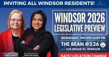 February 10, 2026A reminder to please join me and Rep. Jane Garibay for a Windsor 2026 Legislative Preview tomorrow, Feb. 11 at 6pm at The Bean @226 (226 Broad St., Windsor).
