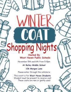 November 5, 2025Winter Coat Shopping Night hosted by West Haven Public Schools starts tonight! New or gently used winter coats will be available, and donations for them will be greatly appreciated. Please see the flyer below for more details.