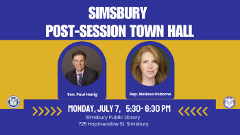 July 2, 2025Join me and Sen. Paul Honig for a post session legislative update on Monday, July 7th, from 5:30–6:30 P.M. at the Simsbury Public Library.