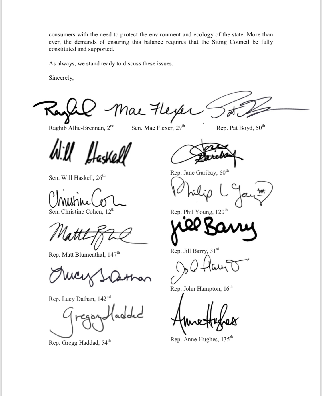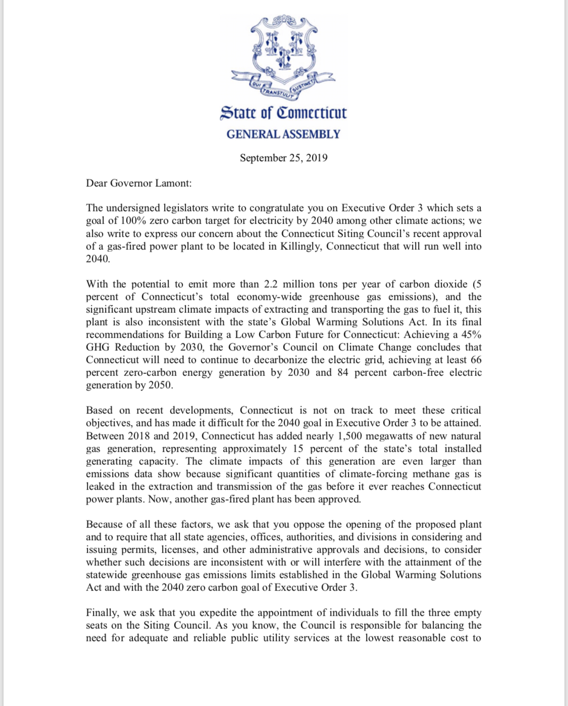 26 members of the Senate and House Democratic caucuses co-signed the Letter sent to the Governor’s Office this morning. The petition urges the administration to oppose the Killingly plant and asks for a review of the permit processes offered through the Connecticut Sitting Council and other state agencies to ensure that they account for Greenhouse Gas (GHG) emissions limits set by state law in 2015 under the Global Warming Solutions Act and this year’s Executive Order 3.