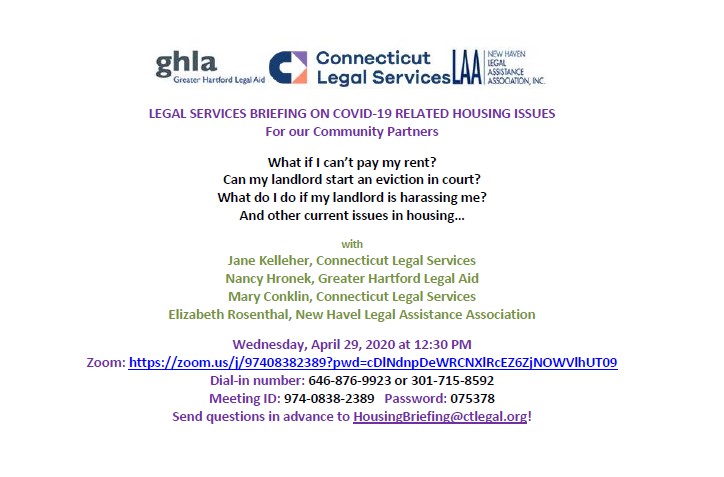Today, April 16 at noon, there will be a legal services briefing on unemployment compensation, paid leave, and workplace safety. The briefing will be hosted by representatives from Greater Hartford Legal Aid, Connecticut Legal Services, and New Haven Legal Assistance Association.