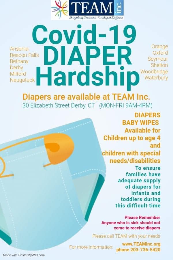 TEAM, Inc in Derby can help those who are in need of diapers and baby wipes. You can pick up these items at 30 Elizabeth Street, Derby, Monday through Friday from 9 a.m. to 4 p.m.