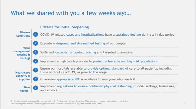 This 4-stage plan was prepared by the Reopen Connecticut Advisory Group and depends on meeting key conditions, like a 14-day decline in hospitalizations, increased testing, contact tracing, social distancing protocols, and more. Masks will be required for most activities during the first stage.