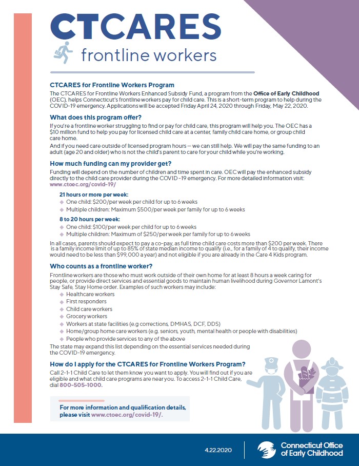 The Office of Early Childhood recently announced it has officially launched its CTCARES for Frontline Workers Program. This new program was designed to aid essential workers during the COVID-19 crisis who are struggling to pay for child care.