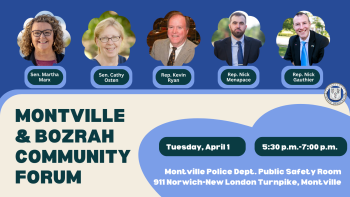 I hope you'll join me and several of my colleagues for a Montville and Bozrah community forum next Tuesday, April 1 from 5:30-7pm at the Montville Police Department's Public Safety Room (911 Norwich-New London Tpke., Montville).