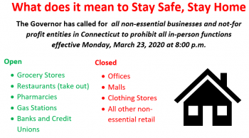 March 22, 2020As a reminder, the 'Stay Safe, Stay Home' directive was issued as an Executive Order by Governor Ned Lamont on Friday and goes into effect Monday night, March 23rd at 8 p.m.