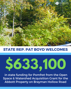July 18, 2025I hope this message finds you and your family well and staying cool on these warm days. I am excited to share that Pomfret received state funding this week through the Open Spaces and Watershed Acquisition (OSWA) Grant Program for the Abbott Property on Brayman Hollow Road (Rt. 244).