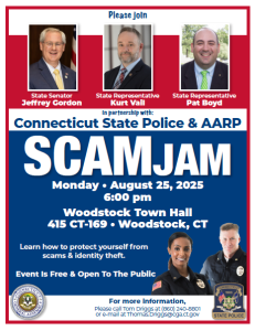 August 20, 2025Please join me, Senator Jeff Gordon, and State Representative Kurt Vail for a ScamJam event next Monday, August 25th. We are partnering with the Connecticut State Police and AARP to provide information on how you and your family members can protect yourself from scams and identity theft.