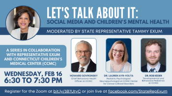 February 14, 2022Join me on Wednesday, February 16th for the second in my series of discussions titled "Let's Talk About It: Social Media and Children's Mental Health", which I will be doing in collaboration with the Connecticut Children's Medical Center.