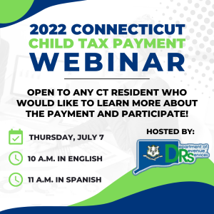 July 7, 2022Today, July 7, the Department of Revenue Services will host a webinar to discuss the 2022 Connecticut Child Tax Payment. If you would like to learn more about the payments, we passed in this year's budget adjustment, I encourage you to participate.