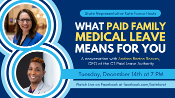 December 9, 2021If you have questions about what our state's Paid Family and Medical Leave program means for you and your family, join me for a conversation with Andrea Barton Reeves, CEO of the CT Paid Leave Authority, on Tuesday, December 14 at 7 p.m.