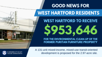 January 7, 2022Senator Derek Slap (D – West Hartford, Farmington, Burlington, Bloomfield), State Representative Kate Farrar (D – West Hartford), West Hartford Mayor Shari Cantor, West Hartford Town Manager Matt Hart, and West Hartford Economic Development Coordinator Kristen Gorski applauded Governor Ned Lamont's announcement that the town will receive $953,646 to remediate a 2.97-acre site at 1051 and 1061 New Britain Avenue, the site of the former Puritan Furniture Store.